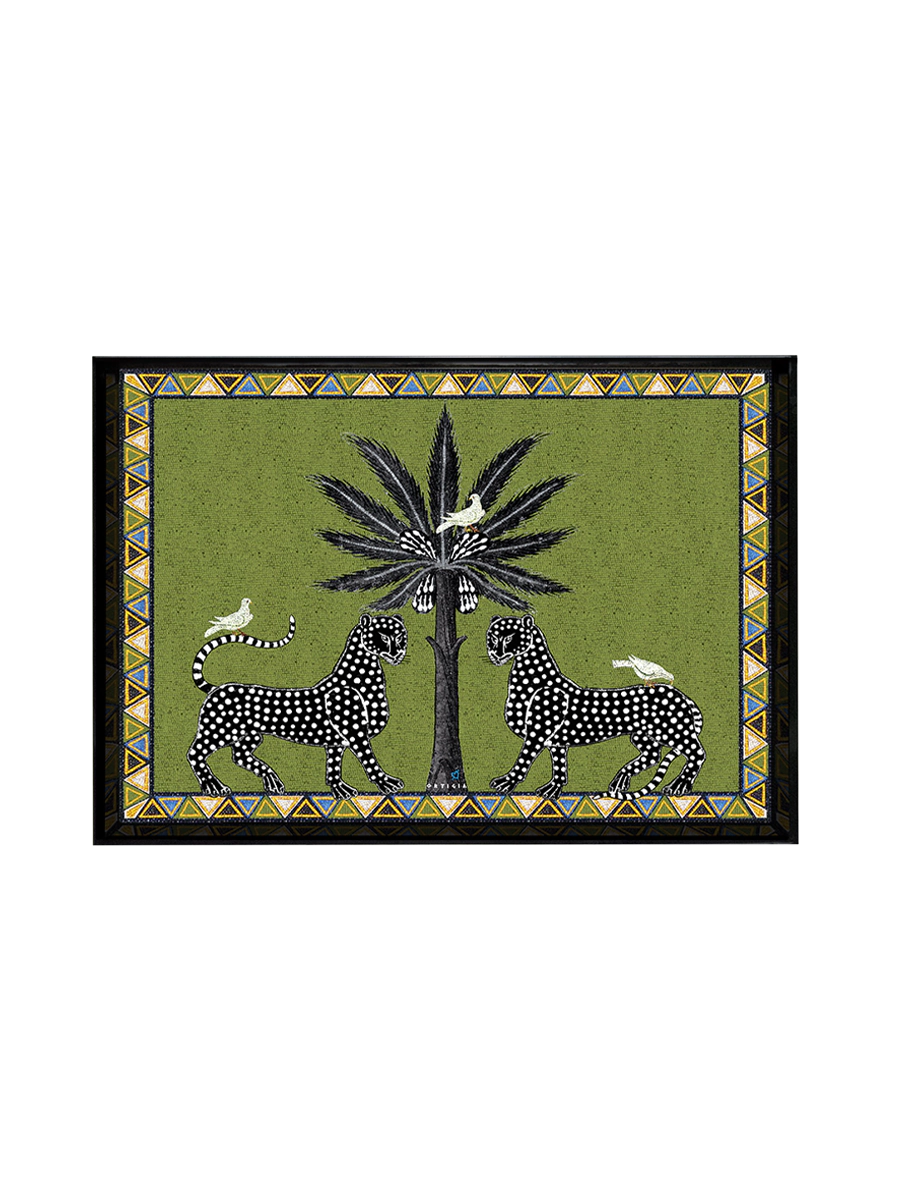 Handmade, lacquered trays featuring a signature Ortigia design of two black leopards and palm trees on a bold yellow background. Ideal for serving tea, drinks or small snacks, this design looks as good on display as it does being used.